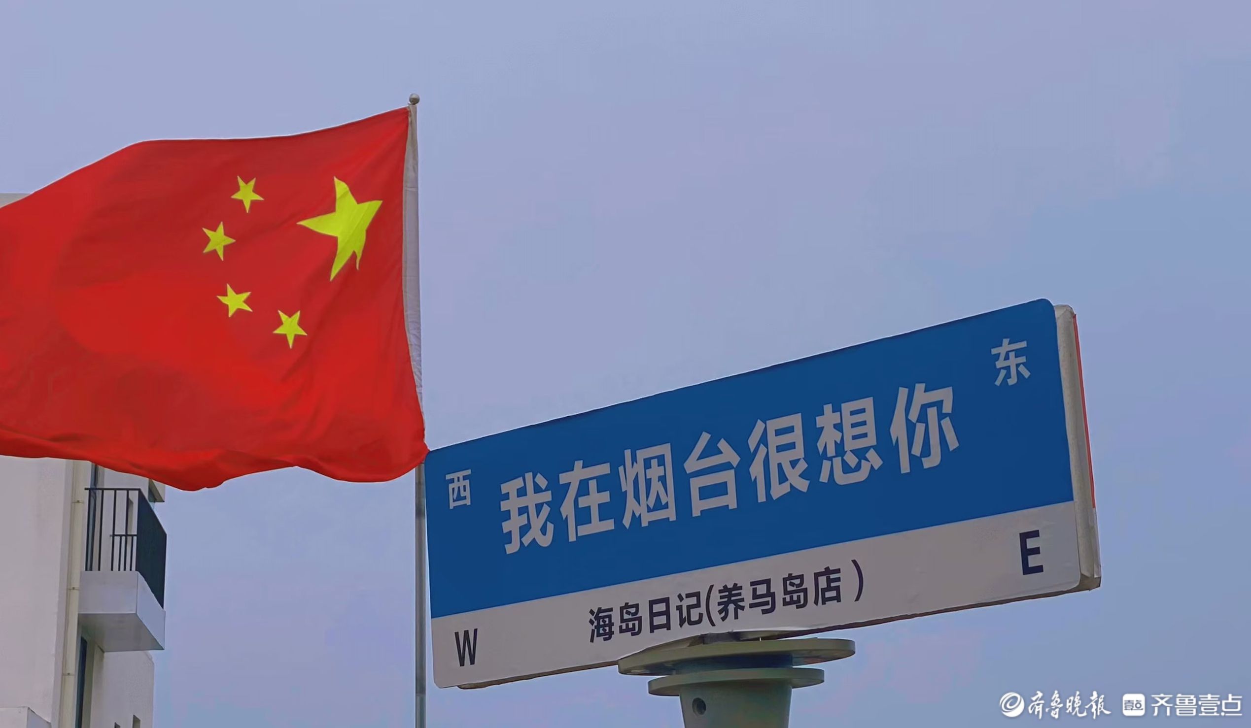 创作思路:回到家乡,看到家乡的路牌和五星红旗映衬天空下