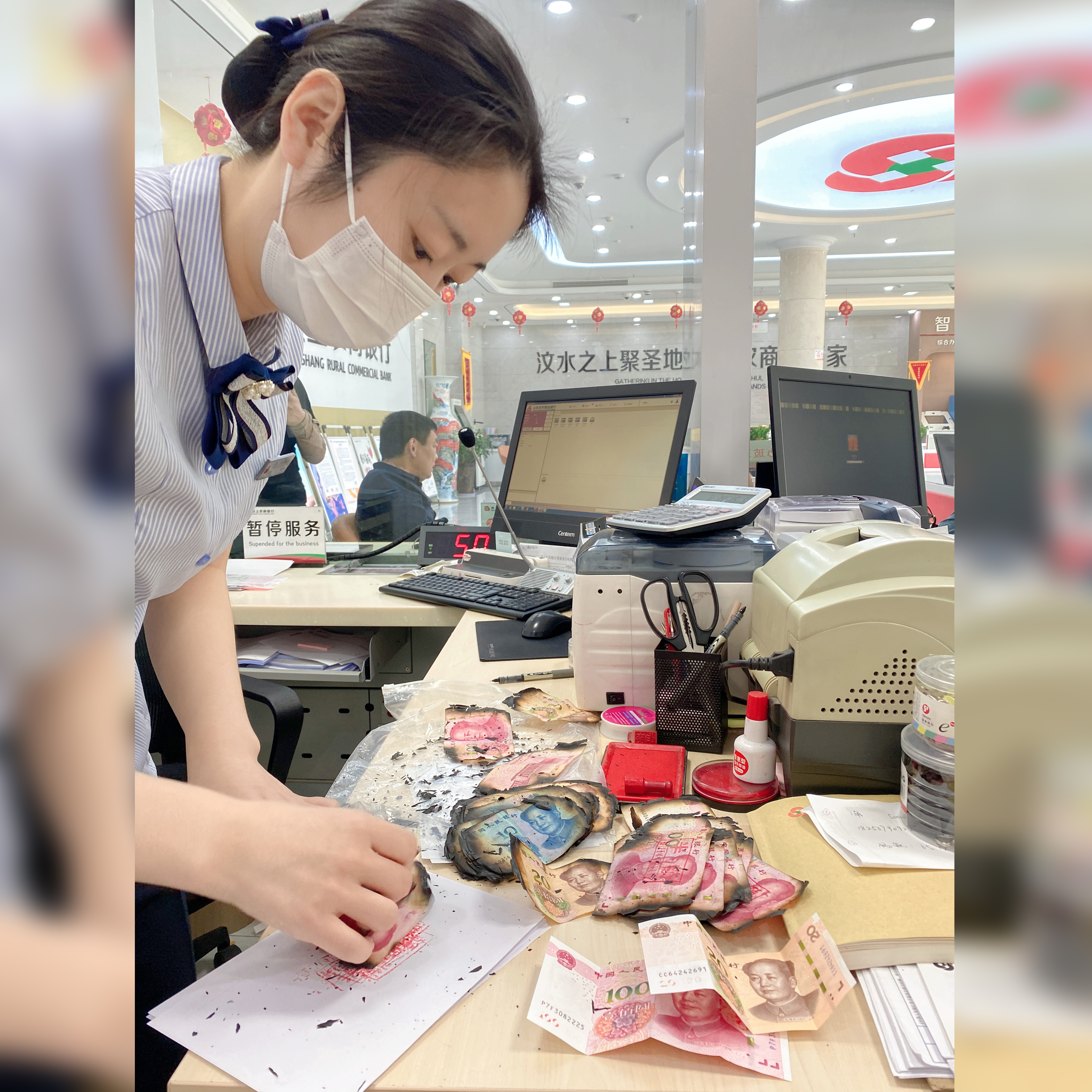 经了解,男子家中发生火灾,存放的一万多元现金也着了火,虽然及时控制了火势,但是现金已经残缺不全。看着自己辛苦积攒的钱被烧,该男子心痛不已,思量过后,便来到农商银行询问是否还可以兑换。