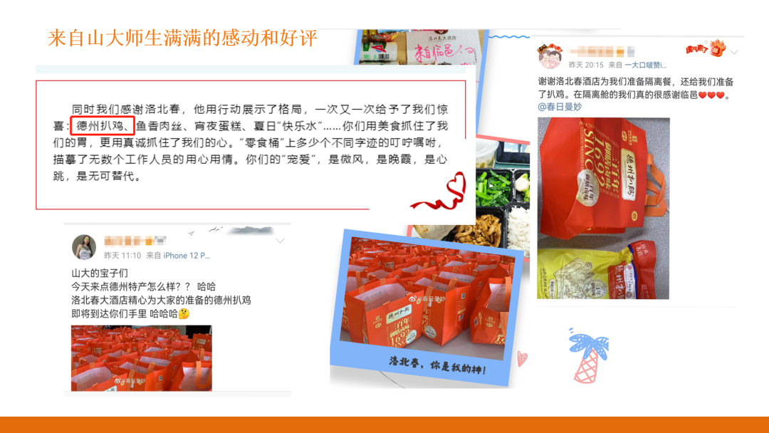 早在2022年5月,洛北春集团与德州扒鸡集团联合,给山东大学隔离师生1000余人送餐,让山东大学师生在特殊时期尝到了德州的家乡特产,并收到来自山东大学师生满满的感动与好评。