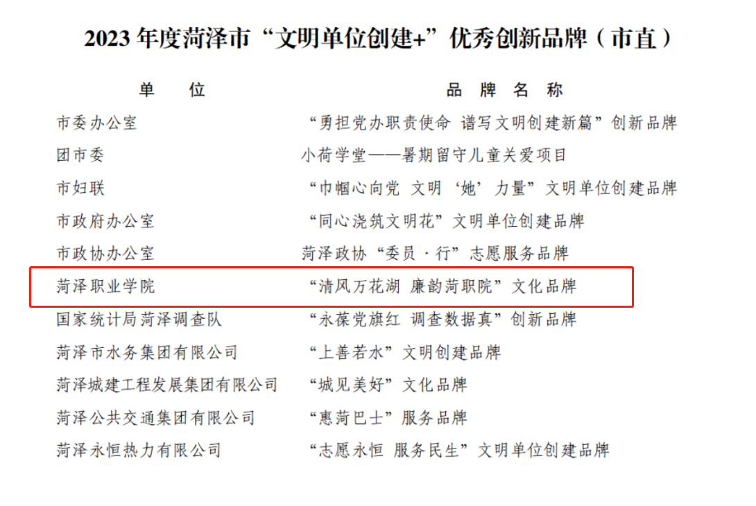 近日,菏泽市文明办发文公布了《关于公布2023年度菏泽市“文明单位创建+”优秀创新品牌的通知》,菏泽职业学院提报的“清风万花湖 廉韵菏职院”文化品牌获得2023年度菏泽市“文明单位创建+”优秀创新品牌。