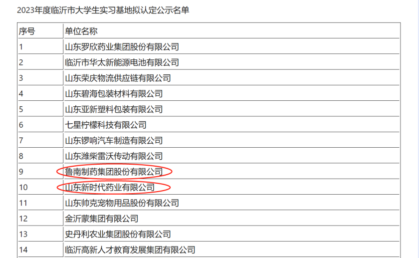 近日,临沂市人力资源和社会保障局公布了“2023年度临沂市大学生实习基地”认定名单,鲁南制药集团股份有限公司及山东新时代药业有限公司均在名单当中。