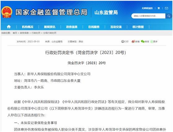 9月1日,国家金融监督管理总局山东监管局官网公示的行政处罚决定书(菏金罚决字〔2023〕20号)显示,新华人寿保险股份有限公司菏泽中心支公司存在以下违法违规行为:
