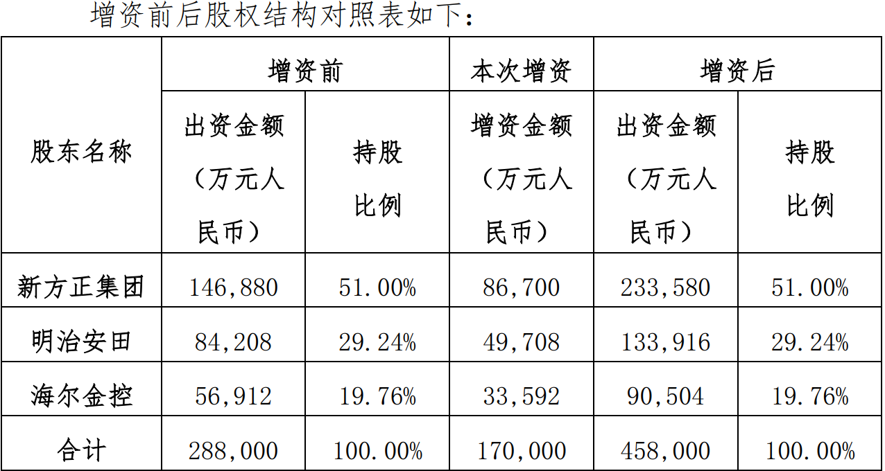 据悉,新增注册资本金由原股东缴足,出资方式为货币。其中,新方正控股发展有限责任公司出资8.67亿元人民币,变更后累计出资为23.36亿元人民币,占变更后注册资本的51.00%;明治安田生命保险相互会社出资5.97亿元人民币,变更后累计出资13.39亿元人民币,占变更注册资本的29.24%;海尔集团(青岛)金盈控股有限公司出资3.36亿元人民币,变更后累计出资9.05亿元人民币,占变更注册资本的19.76%。