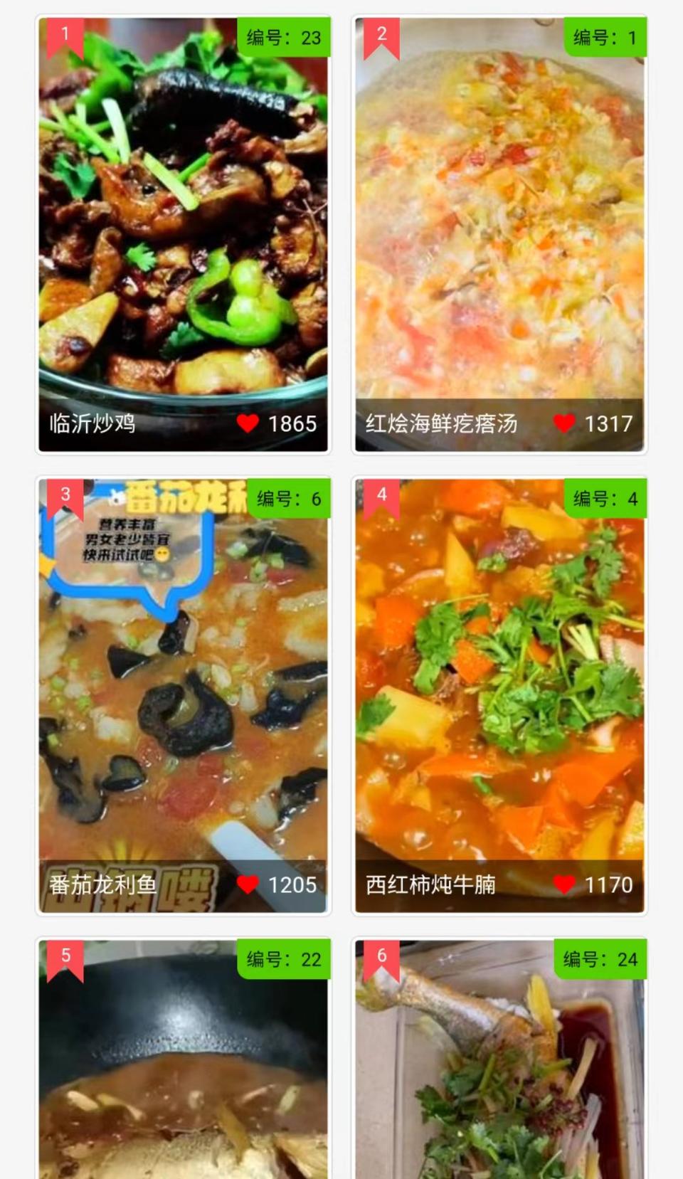 酸辣土豆丝(史玉臣)、徽州臭鳜鱼(李飞)、爆炒腰花(邓君秋)、团团圆圆(苏涛)、菠菜炒鸡蛋(王建平)、地瓜叶黄豆去火汤(毕海霞)、美味三明治(曹琳)、糖醋芝麻豆腐(宫科)、藤椒脆蹄花(刘海涵)、豆腐箱子(尹明玉)、产后美食集锦(逄美芳)、奶汤全家福(李叶龙)、清蒸黄花鱼(韩芬)、补气乌鸡汤(张亮亮)、鲜炒豆腐渣(宫科)、黄豆焖猪蹄(李群)、时蔬团圆饼(李凌云)、山笋煲(王振华)、茭白炒肉丝(辛廷杰)、宫爆虾球(刘洪峰)、炒鸡(刘涛)、手擀面(赵春莲)、泉水鲤鱼(刘长伟)、玉米蔬菜团子(李群)、龙山水豆腐(赵阳波)