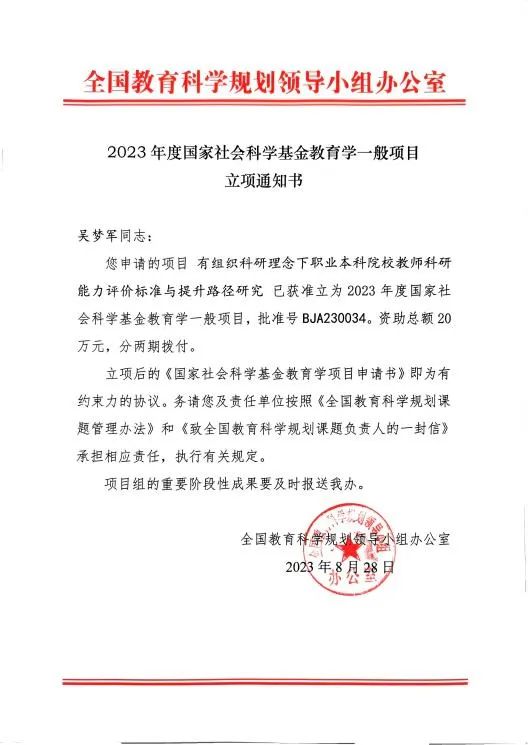 8月28日,全国教育科学规划领导小组办公室公布了2023年度全国教育科学规划立项名单。学校校长吴梦军教授的《有组织科研理念下职业本科院校教师科研能力评价标准与提升路径研究》获批立项,列为国家一般项目。
