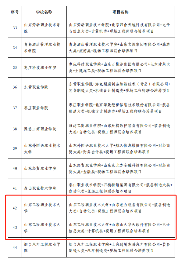 立项2个省级现场工程师专项培养计划项目,分别为学校与山东电力设备有限公司、山东山大华天软件有限公司合作,在“装备制造大类+自动化类”“电子信息大类+计算机类”联合培养现场工程师项目。