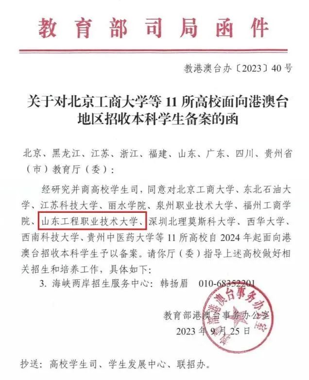 9月25日,教育部港澳台事务办公室下发了《关于对北京工商大学等11所高校面向港澳台地区招收本科学生备案的函》(教港澳台办﹝2023﹞40号),学校获批港澳台地区本科学生招生资格。自2024年起,学校可通过普通高校联合招收华侨港澳台学生考试招收港澳台学生,也可通过台湾“学测”成绩招收台湾学生。2023年12月,济南市港澳台办公室在学校建立港澳台青年交流实践基地。
